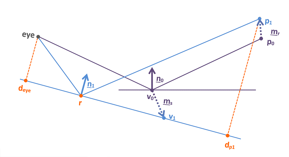 - Solve for the position of the previous reflection point (r) knowing (deye) and (dp1)