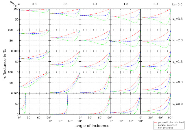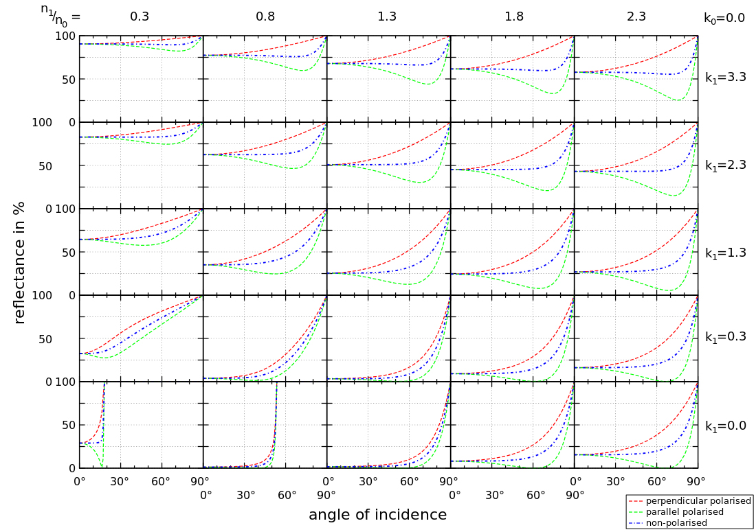 It wasn't clear to me how Fresnel's law of reflection applied to metals. I asked on Twitter what peoples thoughts were on this and got this simple and elegant claim made by Brooke Hodgman: "Metalic reflections are coloured because their Fresnel is wavelength varying, but Fresnel still goes to 1 at 90deg for every wavelength". This convinced me instantly that indeed the correct thing to do was to use an un-tinted Fresnel contribution regardless of the metallicness of the material. I later found this graph which also confirmed this: