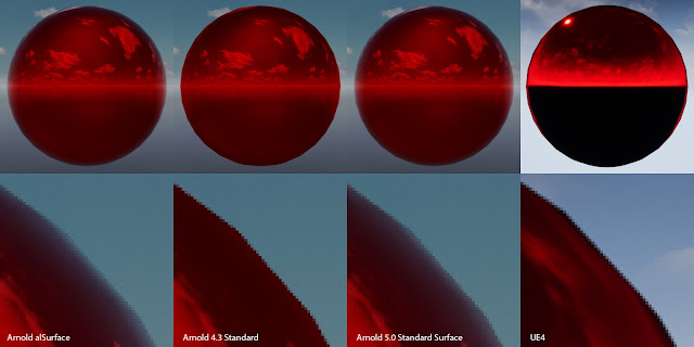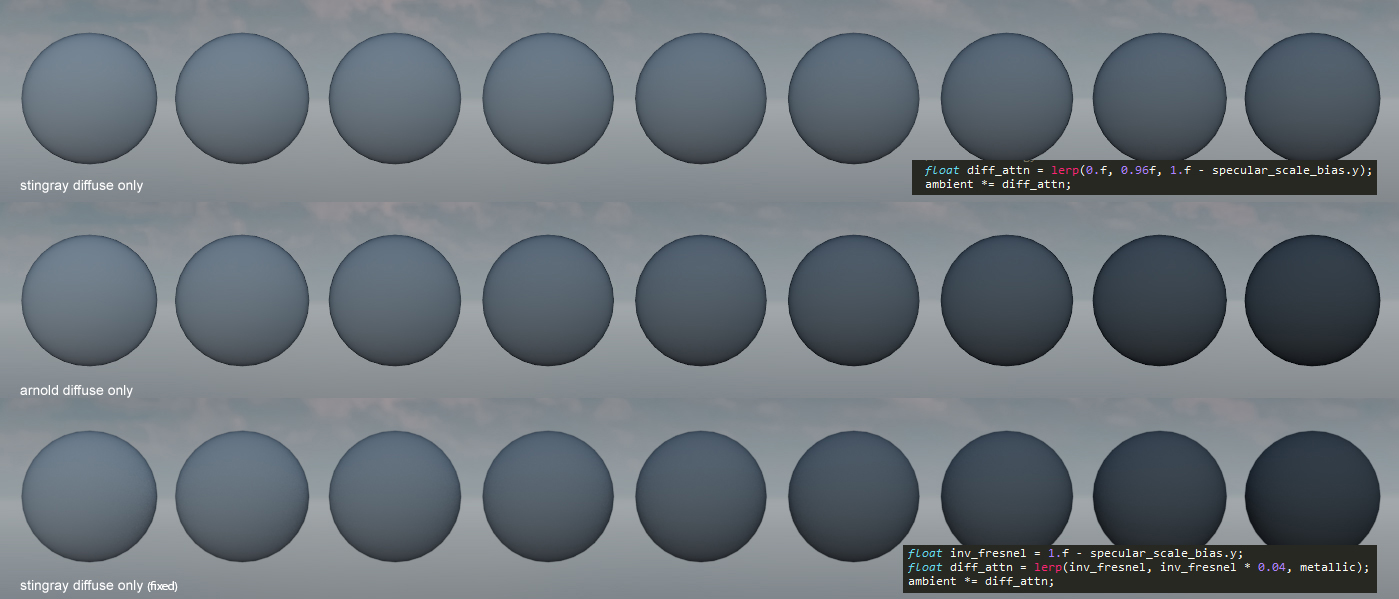 The first thing we noticed is an excess in reflection intensity for reflections with large incident angles. Arnold supports Light Path Expressions which made it very easy to compare and identify the term causing the differences. In this particular case we quickly identified that we had an energy conservation problem. Specifically the contribution from the Fresnel reflections was not removed from the diffuse contribution: