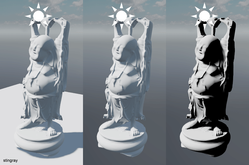 Since there is no convenient way to adjust the white balancing in Stingray, we decided to white balance our camera data and use a pure white light in our Stingray scene. We also decided to compare the photos and renders in linear space in the hope to minimize the source of potential error.