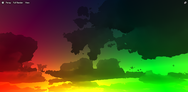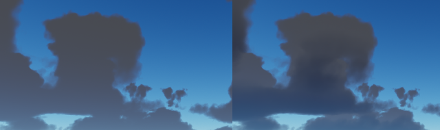 We also need to think of how to handle shadows and reflections. We've done some quick tests by updating a 512x512 opacity shadow map which seemed to work ok. Since it is not a view frustum dependent term we can absorb the cost of updating the map over a much longer period of time than 16 frames. Also, we could generate this map by taking fewer samples in a coarser representation of the clouds. The same approach would work for generating a global specular cubemap.
