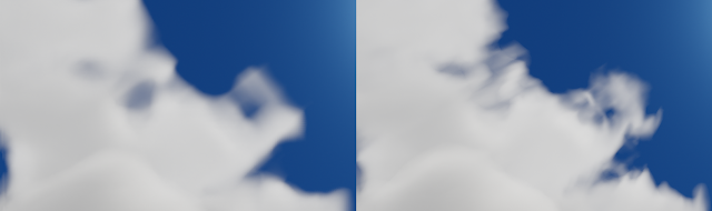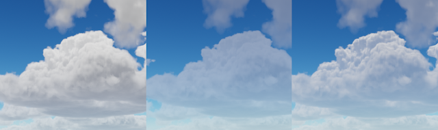 Finding good sampling scales for all of these textures and choosing by how much the extrusion texture should affect the low frequency clouds is very time consuming. With some time you eventually build intuition for what will look good in most scenarios but it’s definitely a difficult part of the process.