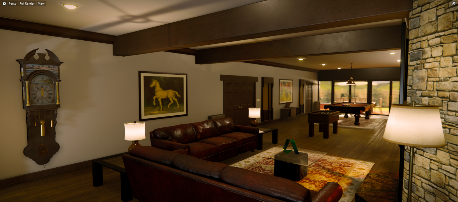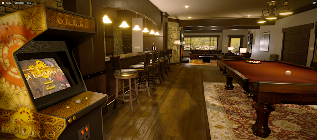 To this end, I started looking for cozy but luxurious spaces on google and eventually came across a nice reference photo I could work with. Warm rich woods, lots of games, a bar, and well... those all speak to me. For better or worse, I felt this room was one I would personally feel comfortable in. So I took on the challenge of re-creating that environment in 3D inside Stingray.